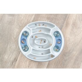 Como los perros son animales muy inteligentes y curiosos, quieren mantenerse ocupados con regularidad. El juego de actividades "Slide and Feed" les ayuda a ello: El tablero de juego tiene varias ranuras en el centro y depresiones circulares en el exterior, que pueden cubrirse con elementos deslizantes.