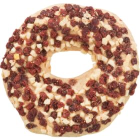 mezcla de 3 anillos masticables diferentes de cuero crudo con a) pato, calabaza y plátano, b) bacalao, fresa y manzana, c) pollo